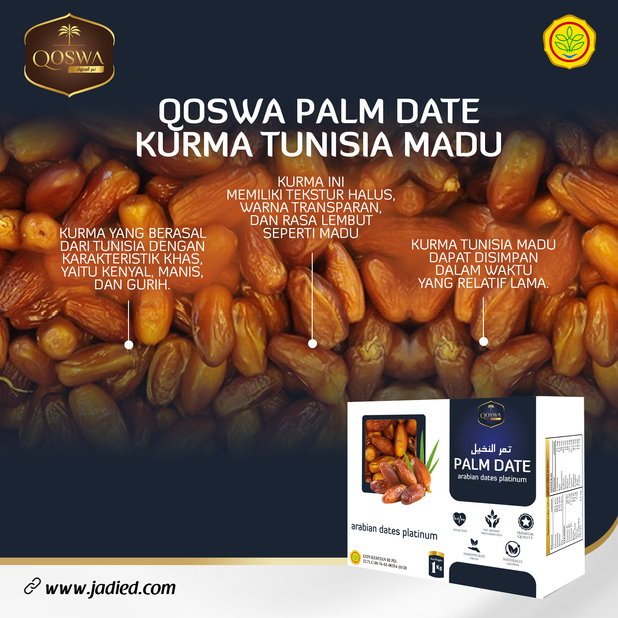 Kurma Palm Date,merupakan salah satu kurma premium asal Tunisia yang terkenal dengan cita rasanya yang manis alami dan teksturnya yang lembut. Tersedia dalam kemasan praktis 500 gram dan 1 kilogram.
